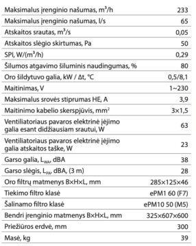 - Maksimalus oro srautas 233 m3/h